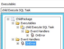 默认情况下,当前Task组件的事件处理程序中把错误(Error)事件处理之后,SSIS引擎仍然把错误事件向上层事件处理程序传递,直到包层次结构的最顶层,如下图,在ChildPackage的Package级别和Executable级别上分别创建了OnError事件处理程序,Executable级别是child Execute SQL Task: