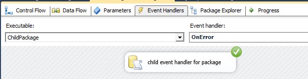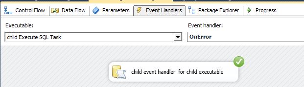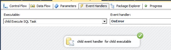 执行Package,在child Execute SQL Task中触发错误事件,被该Task的事件处理程序捕获和处理,下图是Executable级别的OnError事件处理程序,其成功执行一个Task:
