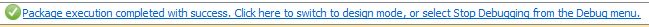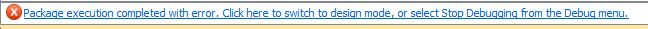 但是,错误事件没有停止,而是继续向上传递,被其直接上级,也就是Package级别的OnError事件处理程序捕获,如下图,来自子Task组件的错误事件被父级处理之后,Package仍然报错,错误消息是:Package execution completed with error.