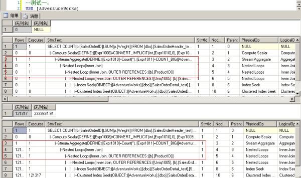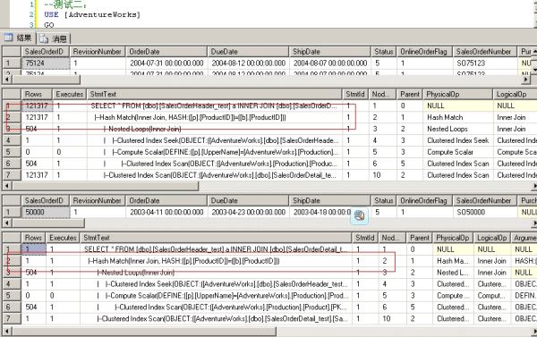 --测试二: USE [AdventureWorks] GO DBCC freeproccache GO SET STATISTICS PROFILE ON EXEC [dbo].[Sniff] @i = 75124 -- int --发生编译,插入一个使用hash match联接的执行计划 GO EXEC [dbo].[Sniff] @i = 50000 -- int --发生执行计划重用,重用上面的hash match的执行计划 GO