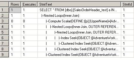 USE [AdventureWorks] GO DROP PROC NoSniff_QueryHint_Recompile GO CREATE PROC NoSniff_QueryHint_Recompile(@i INT) AS SELECT COUNT(b.[SalesOrderID]),SUM(p.[Weight]) FROM [dbo].[SalesOrderHeader_test] a INNER JOIN [dbo].[SalesOrderDetail_test] b ON a.[SalesOrderID]=b.[SalesOrderID] INNER JOIN [Production].[Product] p ON b.[ProductID]=p.[ProductID] WHERE a.[SalesOrderID]=@i OPTION(RECOMPILE) GO