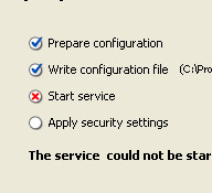 纠结了挺久,也忘了是看到什么文章触发了灵感,反正后来才知道原来是数据引擎不同惹的祸。于是就想到重新运行次设置向导,把数据库类型改成支持InnoDB引擎的。马上行动,在向导里设置数据库类型(也就是图1的database usage)那里,设置成第二项,还在后面的InnoDB Tablespace Settings里把InnoDB数据文件设置放在D:\MySQL InnoDB Datafiles目录里。但是在最后execute执行的时候,却老是在Start Service那里出问题,如下图2。