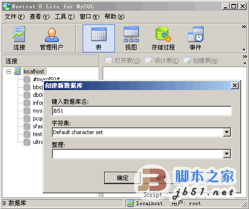 第三步:输入jb51,下面是默认的字符,一般情况下gbk默认就可以。如果是utf8的最好选择想对应的字符,防止乱码的出现。