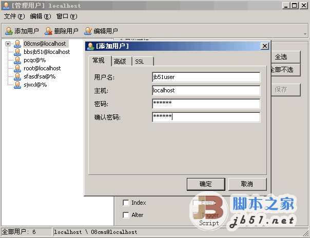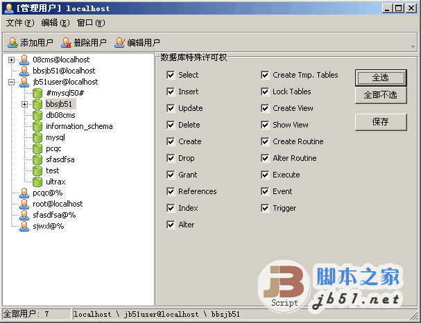 第五步:新建用户后,点击展开就能看到多个数据库,可以选择我们上面创建的数据库jb51,这里以bbsjb51为例子,主要是看数据库特殊许可权,一般全选即可,如果为了安全,可以更细的设置权限。例如:只给select。
