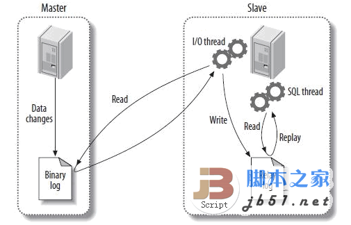 首先主服务器把数据变化记录到主日志,然后从服务器通过I/O线程读取主服务器上的主日志,并且把它写入到从服务器的中继日志中,接着SQL线程读取中继日志,并且在从服务器上重放,从而实现MySQL复制。具体如下图所示: