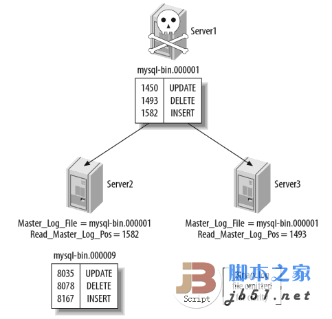 在一主(Server1)两从(Server2,、Server3)的环境中,Server1宕机后,等到Server1和Server2把宕机前同步到的日志都执行完,比较Master_Log_File和Read_Master_Log_Pos就可以判断出谁快谁慢,因为Server2从 Server1同步的数据(1582)比Server3从Server1同步的数据(1493)新,所以应该提升Server2为新的主服务器,那么 Server3在CHANGE MASTER TO到Server2的时候应该使用什么样的参数呢?1582-1493=89,而Server2的最后的二进制日志位置是8167,所以答案是 8167-89=8078。