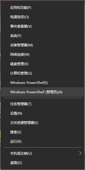 3.用管理员启动命令行,win10是右键左下角win图标,选择“Windows powershell(管理员)”。