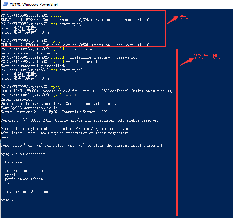 2.我并不是按照上面的顺序成功的,实际是失败了很多次之后,按照博客的方法执行了mysqld--removemysql,然后把data文件夹和my.ini文件删除了,从第4部开始,后面成功了。