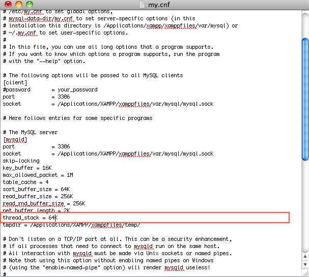 To resolve this issue you need to change the default value of parameter 'thread_stack' in /etc/my.cnf in your MySQL configuration file. I use the XAMPP for php/mysql development.