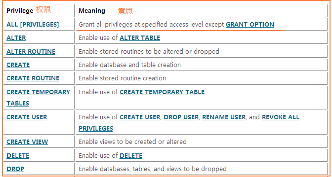 这段话的意思是说:grant命令允许系统管理员对mysql 用户账号(user account)授予各类权限(grant privileges),grant当然也可以用于设置帐号的其他特征如安全连接和服务资料访问限制等,为使用grant命令,必须有GRANT OPTION 权限,同是你必须有你要授予权限的权限!