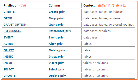 SHOW GRANTS;SHOW GRANTS FOR CURRENT_USER;SHOW GRANTS FOR CURRENT_USER();在本机上运行命令的效果(当用使用的root用户连接到mysql)使用grant命令前,需要搞清楚以下信息:grant 的类型,即你要授予什么权限(privilege type),是允许查询?插入行?创建?还是其他等等。grant 的对象类型(priv_type),有三种:TABLE、 FUNCTION、PROCEDURE,还有一种是默认的,就是DATABASE数据库。grant 的对象(priv_level):是作用于所有数据库呢?还是作用于某一数据库,是作用于数据库的所有表,还是某一个单一的表,甚至是表中的某些列!可以这样做个想象,用户就是一个城管执法者:他有那些权限(privilege type),驱赶走鬼?没收走鬼的东西?他管理那类(priv_type)走鬼呢?卖水果的?烘烤的还是卖钸口的?他管理的范围是什么:整个区?某条街道?最后,不同的权限会能或不能作用于不同的对象类型和范围,以下是部分截图,具体可能参考: