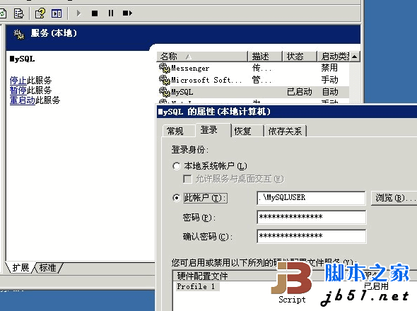 又研究了半天,最后终于搞定,发现他原来的计算机管理员用户名里有个$字符,心想不会是他的事儿吧,就建了一个正常的独立计算机账户MySQLUSER,然后在进程里把mysqld.exe结束,然后在MySQL所在的目录上点右键属性安全,添加MySQLUSER这个用户并给完全控制权限,再打开服务管理器在MySQL服务上点右键,输入刚才建立的账号和密码确定,如下图!