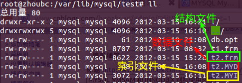 > 存储结构:数据文件(.MYD),索引文件(.MYI)和结构文件(.frm)