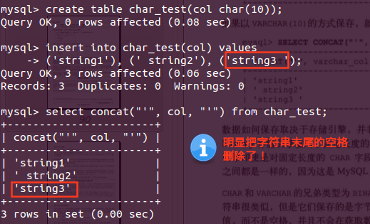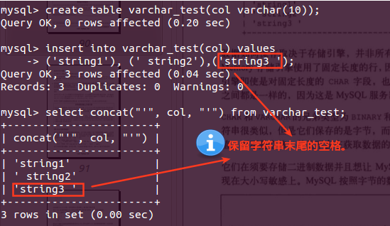 (4)5.0版本以上,无论是取值还是保存,MySQL都会保留字符串末尾的空格。