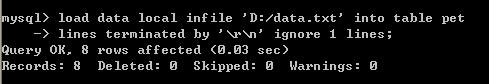 load data local infile 'D:/data.txt' into table pet