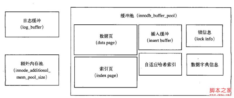 存储引擎组成:缓冲池(buffer pool)、重做日志缓冲池(redo log buffer)以及额外的内存池(additional memory pool).具体配置可由show variables like 'innodb_buffer_pool_size'、show variables like