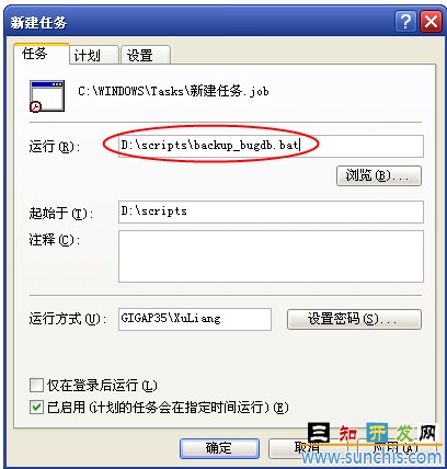 在“运行”里面通过浏览按钮找到刚保存的backup.bat批处理文件,在“计划”选项卡和“设置”选项卡里根据自己的实际需要进行设定,设置完毕后点“确定”进行保存该任务。接下来系统会在指定的时间里周期性地运行此脚本,从而达到自动备份数据库的目的。
