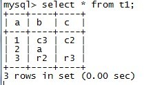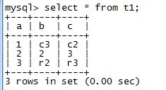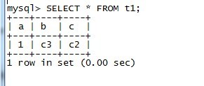 mysql> insert into t1(b,c) select 'r4','r5'; Query OK, 1 row affected (0.05 sec) Records: 1 Duplicates: 0 Warnings: 0 mysql> select * from t1; +---+----+----+ | a | b | c | +---+----+----+ | 1 | c3 | c2 | | 2 | a | | | 3 | r2 | r3 | | 5 | r4 | r5 | +---+----+----+ 4 rows in set (0.00 sec)