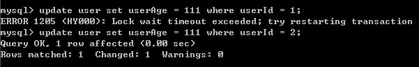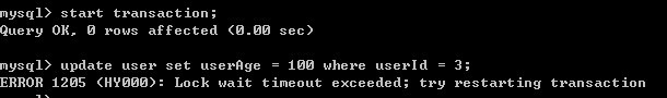 8)B表重新开始事务,并对user表进行修改,修改被挂起,直到超时,对另一条记录修改却成功,说明A对表进行修改时加了行共享锁(可以select)