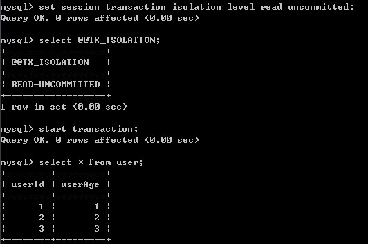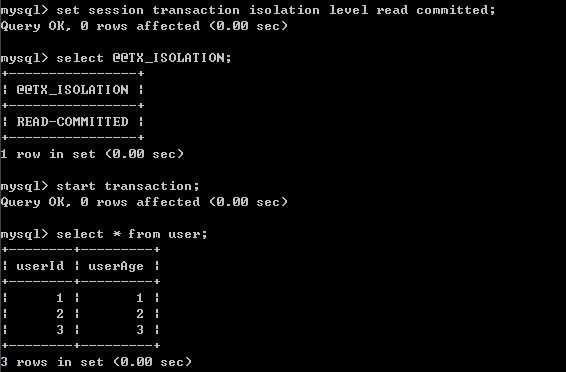 1)A修改事务级别并开始事务,对user表做一次查询
