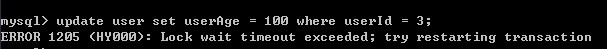 7)B重新开始事务,并对user表同一条进行修改,发现修改被挂起,直到超时,但对另一条记录修改,却是成功,说明A的修改对user表加上了行共享锁(因为可以select)