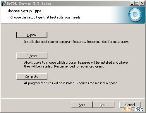 选择安装类型,有“Typical(默认)”、“Custom(自定义)”、“Complete(完全)”三个选项,我们选择“Custom”,如图:
