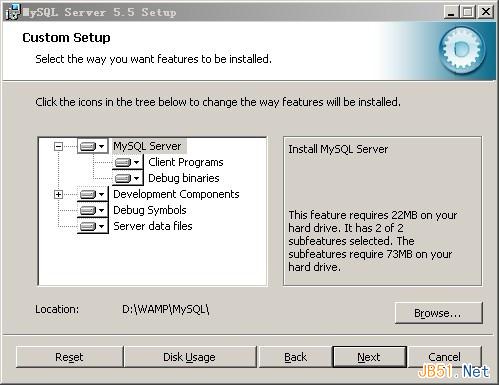 在Custom自定义安装中,我们可以选择安装路径,这里我们将MySQL安装到D:\WAMP\MySQL,按“Next”继续。