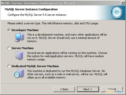 选择服务器类型,“Developer Machine(开发测试类,MySQL占用很少资源)”、“Server Machine(服务器类型,MySQL占用较多资源)”、“Dedicated MySQL Server Machine(专门的数据库服务器,MySQL占用所有可用资源)”,根据自己的类型选择,我们这里选择第一个,点击“Next”继续。