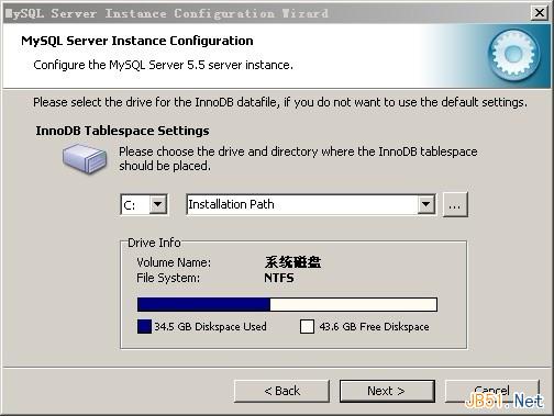 对InnoDB Tablespace进行配置,就是为InnoDB 数据库文件选择一个存储空间,如果修改了,要记住位置,重装的时候要选择一样的地方,否则可能会造成数据库损坏,当然,对数据库做个备份就没问题了,这里不详述。使用默认位置就可以了,点击“Next”继续。