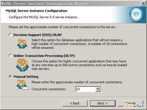 选择您的网站的一般MySQL访问量,同时连接的数目,“Decision Support(DSS)/OLAP(20个左右)”、“Online Transaction Processing(OLTP)(500个左右)”、“Manual Setting(手动设置,自己输一个数)”,由于我们主要在自己机器上做开发测试用,这里选”Manual Setting”,然后选填的是10个连接数,点击“Next"继续。