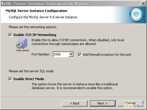 是否启用TCP/IP连接,设定端口,如果不启用,就只能在自己的机器上访问mysql数据库,如果启用,把前面的勾打上,Port Number(端口号):3306,“Add firewall exception for this port”是一个关于防火墙的设置,将监听端口加为windows防火墙例外,避免防火墙阻断。还有一项”Enable Strict Mode(启用标准模式)”,如果选中MySQL就不会允许细小的语法错误。如果您还是个新手,我建议您取消标准模式以减少麻烦。但熟悉MySQL以后,尽量使用标准模式,因为它可以降低有害数据进入数据库的可能性。都配置好后,点击“Next”继续。