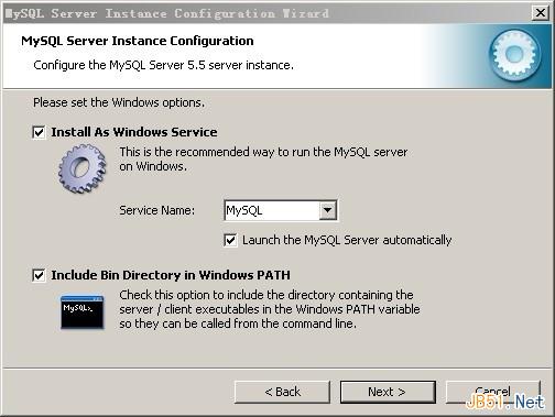 是否将MySQL安装为Windows服务,还可以指定Service Name(服务标识名称),是否将MySQL的Bin目录加入到Windows PATH(加入后,就可以直接使用Bin下的文件,而不用指出目录名,比如连接,”mysql.exe -uusername -ppassword;”就可以了,不用指出mysql.exe的完整地址,很方便),我这里全部打上了勾,Service Name不变,按“Next”继续。