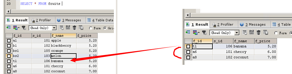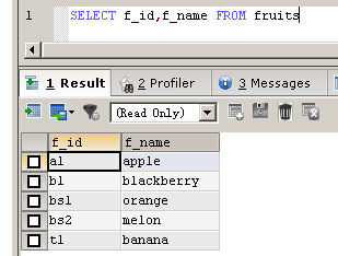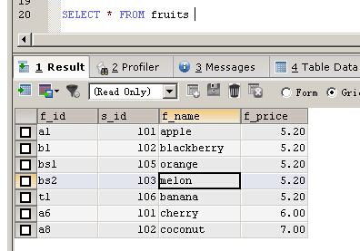 SELECT * FROM fruits SELECT f_id,f_name FROM fruits WHERE f_price >5.1 SELECT f_id,f_name FROM fruits WHERE s_id IN(101,102) SELECT f_id,f_name FROM fruits WHERE s_id NOT IN(101,102) SELECT f_id,f_name FROM fruits WHERE f_price BETWEEN 2 AND 10 SELECT f_id,f_name FROM fruits WHERE f_price NOT BETWEEN 2 AND 10