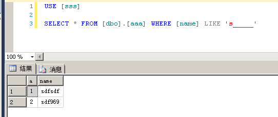 USE [sss] GO SELECT * FROM [dbo].[aaa] WHERE [name] LIKE 's_____'