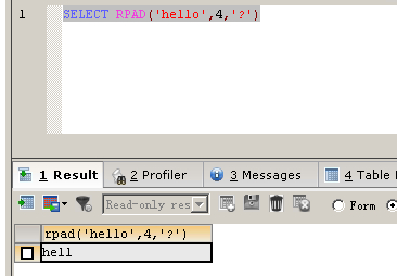 字符串“hello”长度大于4,不需要填充,因此RPAD('hello',4,'?')只返回被缩短的长度为4的子串"hell"