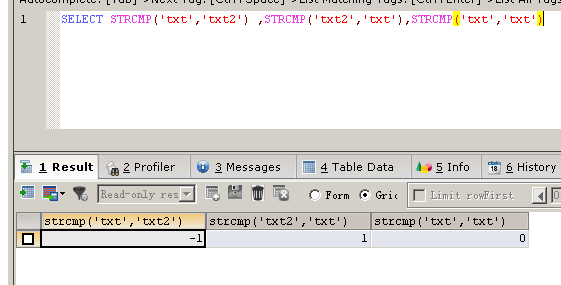 SELECT STRCMP('txt','txt2') ,STRCMP('txt2','txt'),STRCMP('txt','txt')