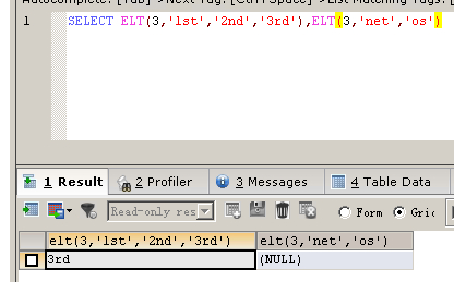 SELECT ELT(3,'1st','2nd','3rd'),ELT(3,'net','os')