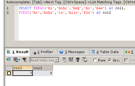 FIELD('hi','hihi','lo','hilo','foo') 列表中没有字符串hi,因此返回结果为0