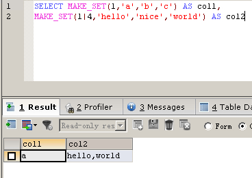 SELECT MAKE_SET(1,'a','b','c') AS col1, MAKE_SET(1|4,'hello','nice','world') AS col2