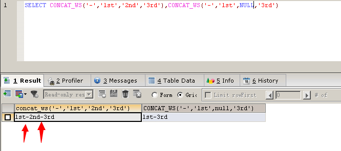 SELECT CONCAT_WS('-','1st','2nd','3rd'),CONCAT_WS('-','1st',NULL,'3rd')