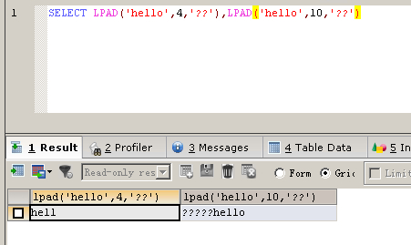 SELECT LPAD('hello',4,'??'),LPAD('hello',10,'??')
