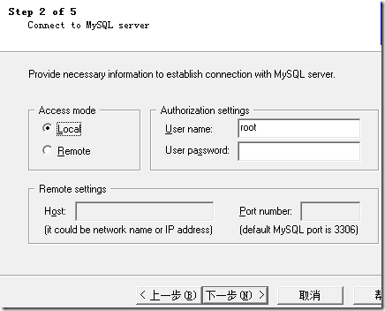 这次是需要连接到MySQL server了,我是本地,所以选择了Local,填写上你的用户名和密码