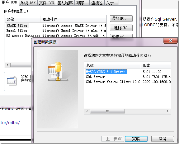 ODBC分32,64位,一开始下了个32位,在Win7 64位上面显示不出来,又从mysql官网下载了64位版本才可以选择添加