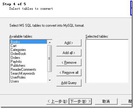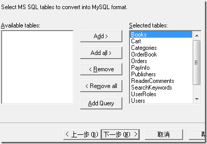 选择需要转换的表,添加到转换列表中,我是需要全部的表,所以选择了Add all