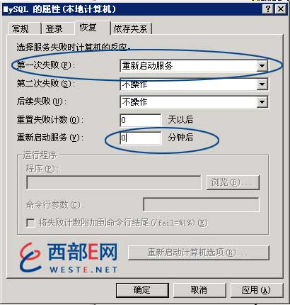 开始菜单 -> 运行 -> services.msc,找到mysql的服务并双击,点击恢复选项卡。