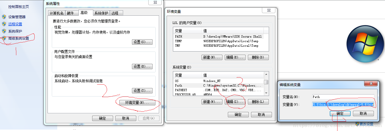右键我的电脑->属性->高级系统设置->高级->环境变量