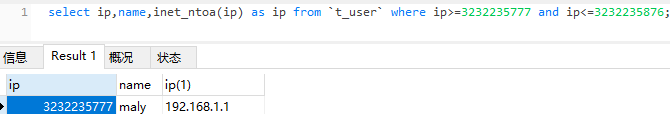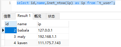 INSERT INTO `t_user` ( `id`, `name`, `ip` ) VALUES ( 2, 'babala', inet_aton( '127.0.0.1' ) ), ( 3, 'maly', inet_aton( '192.168.1.1' ) ), ( 4, 'kaven', inet_aton( '111.175.7.143' ) );