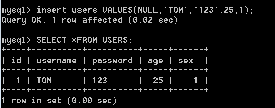 INSERT USERS VALUES(NULL,'TOM','123',25,1);