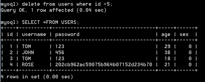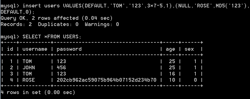 INSERT users VALUES(DEFAULT,'TOM','123',3*7-5,1),(NULL,'ROSE',MD5('123'),DEFAULT,0);