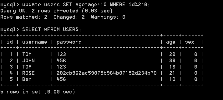 UPDATE users SET age=age+10 WHERE id%2=0;